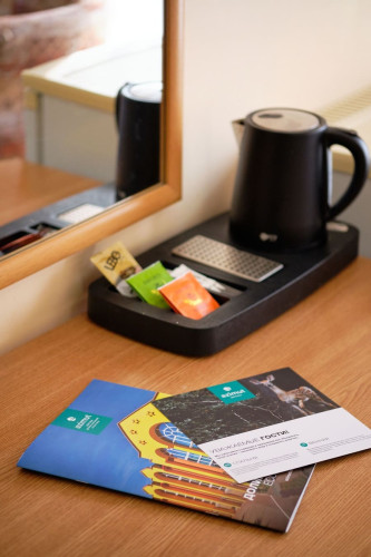 The rooms are equipped with tea stations, with tea pairs, tea, coffee and sugar.