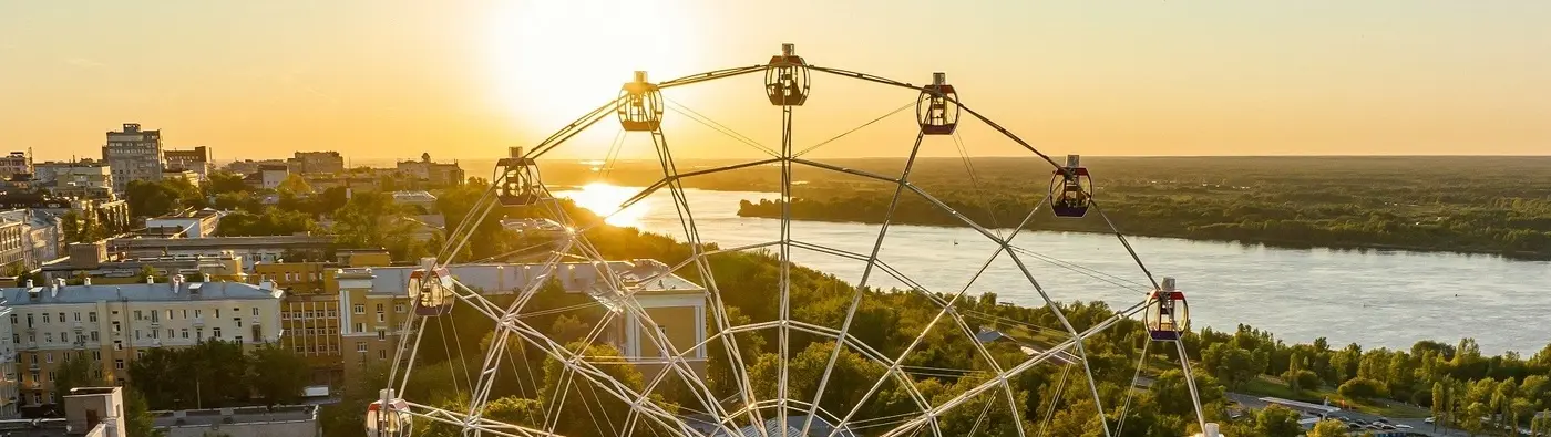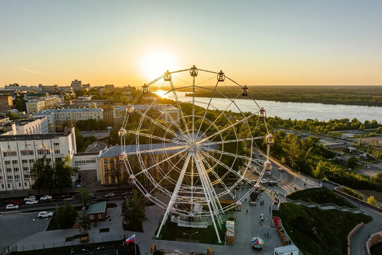 Rising to a height of 50 meters, tourists enjoy a magnificent panoramic view of the picturesque landscapes of Nizhny Novgorod: the Volga River, the suspended cable car, the sports springboard.