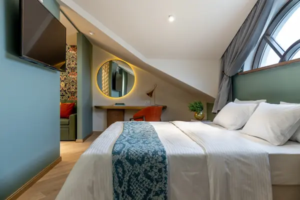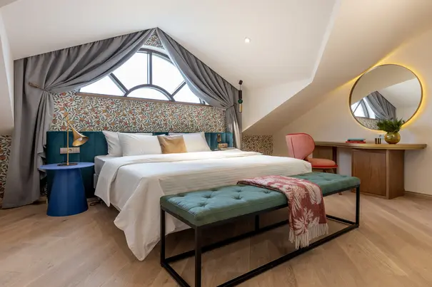 A large arched window fills this spacious Deluxe Attic Room with natural light, creating a pleasant atmosphere for relaxation and work. The room features a stylish daybed that can be used as an extra bed for a child. A tea and coffee station are also included, so you can enjoy your favorite beverage at any time. The modern bathroom is separated from the sleeping area by a glass door with a curtain, ensuring comfort and privacy. Artistic accents enhance the room's unique character.