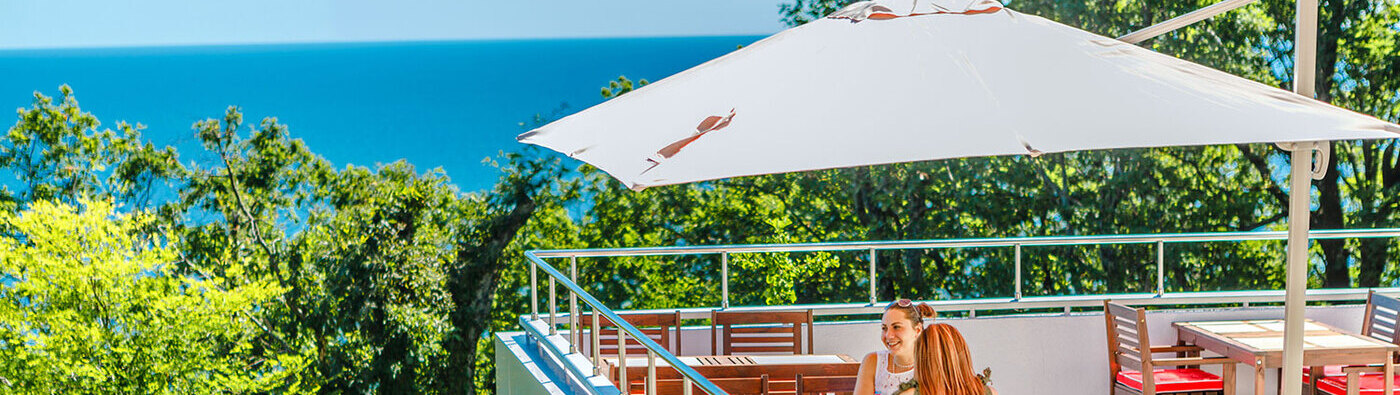 Зал плавно переходит в открытую террасу с великолепным видом на море. Это превосходное место для встреч с друзьями или уединенного размышления.
