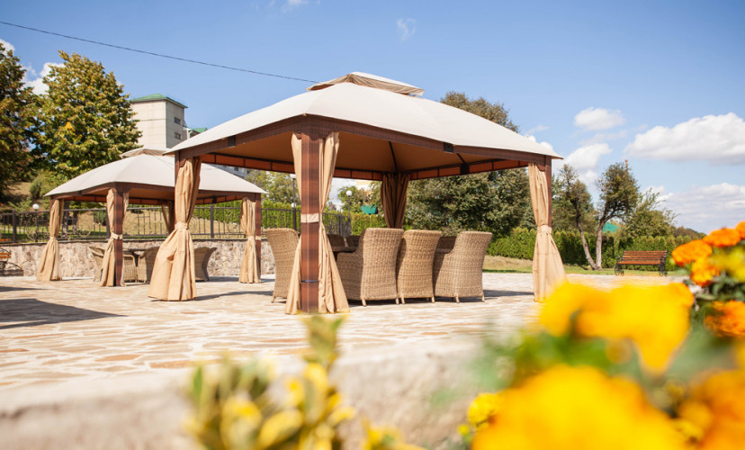 На территории отеля есть собственный ресторан (работает с 11:00 до 00:00), а также летняя веранда (работает с 11:00 до 00:00), по запросу можем выслать меню.